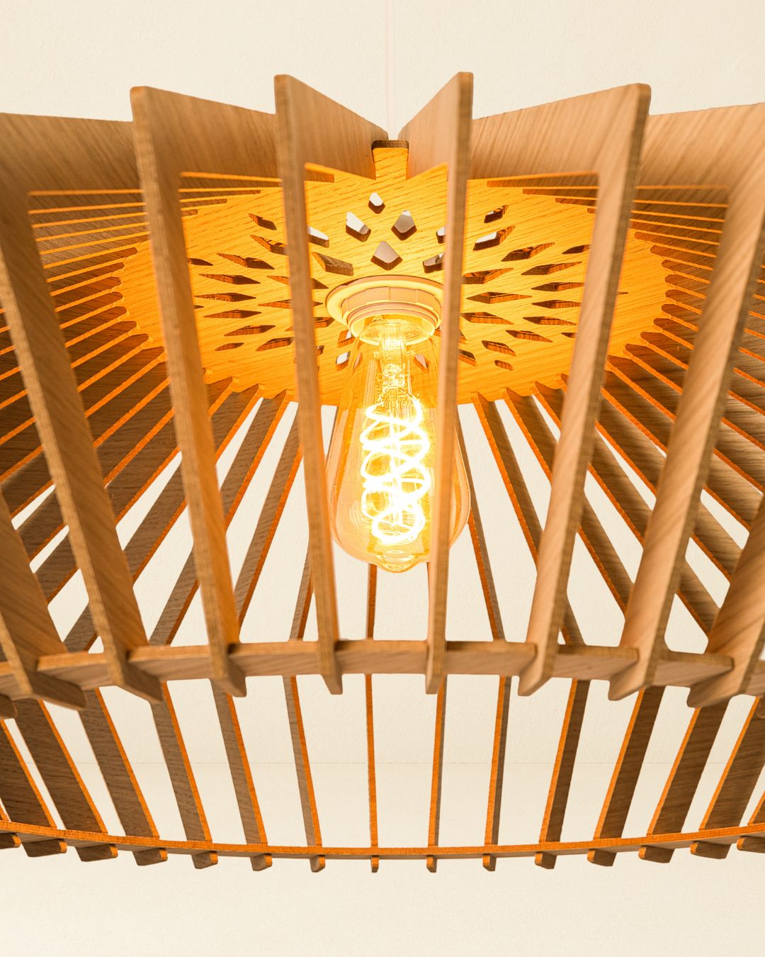 Nous utilisons un plaquage de chêne véritable certifié PEFC, garantissant une gestion durable et responsable des forêts. Ce matériau offre un veinage naturel, une grande stabilité et une structure légère et durable pour chacun de nos luminaires.
